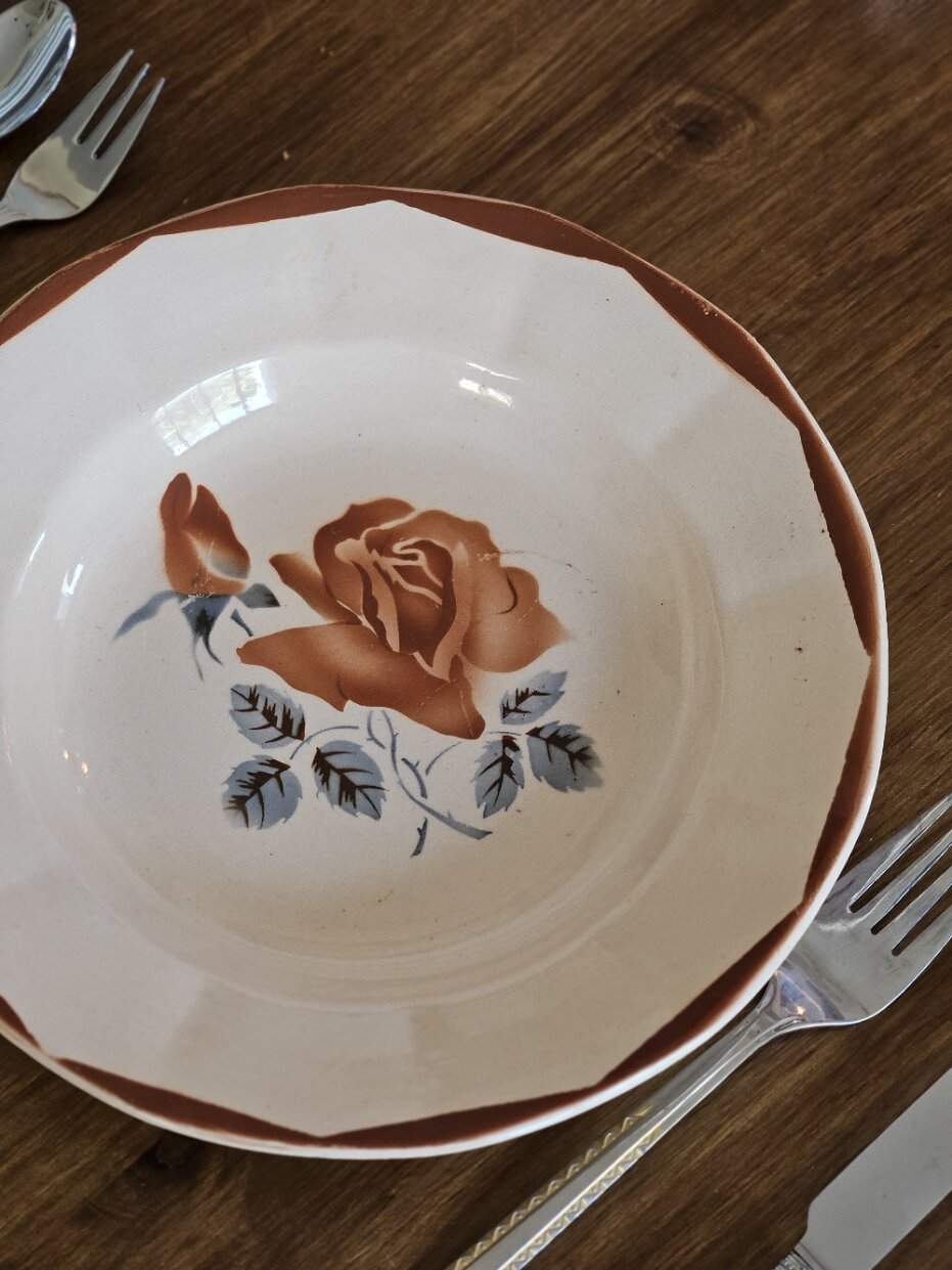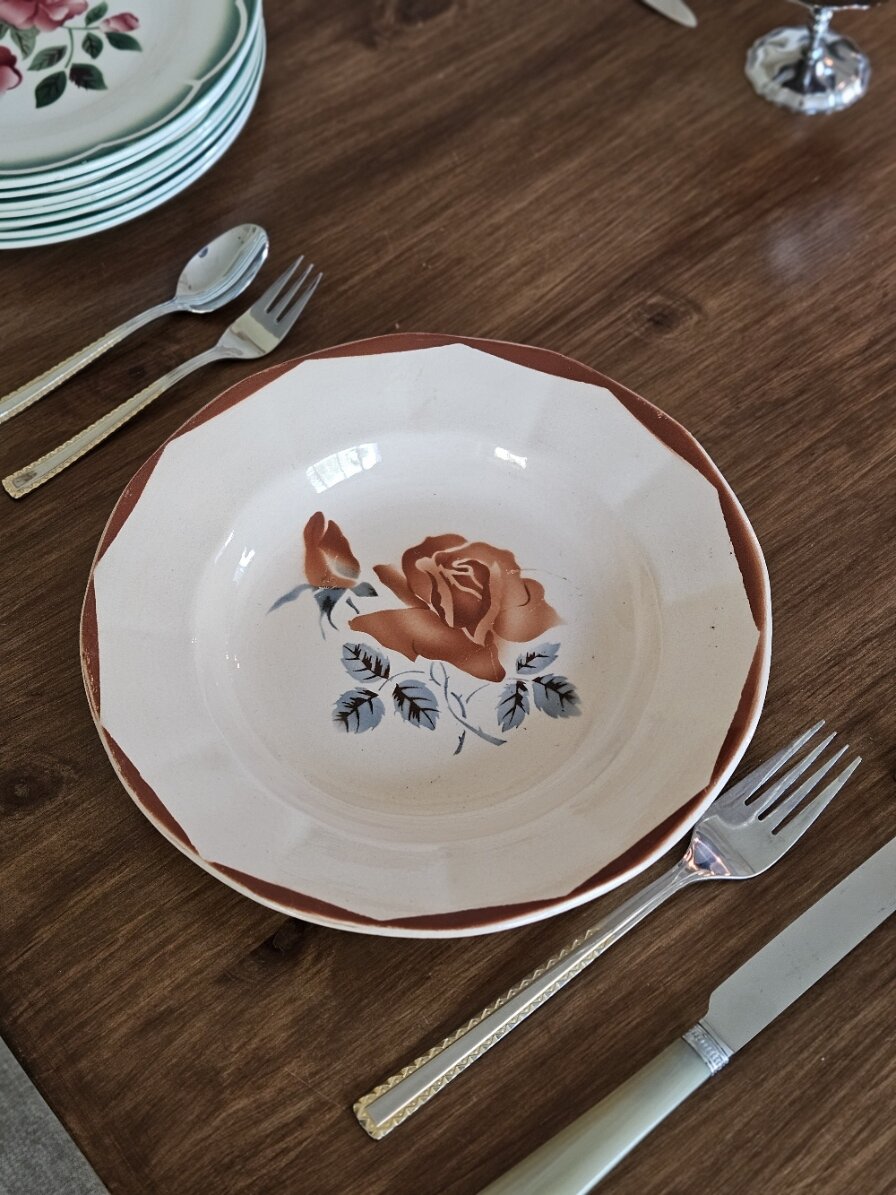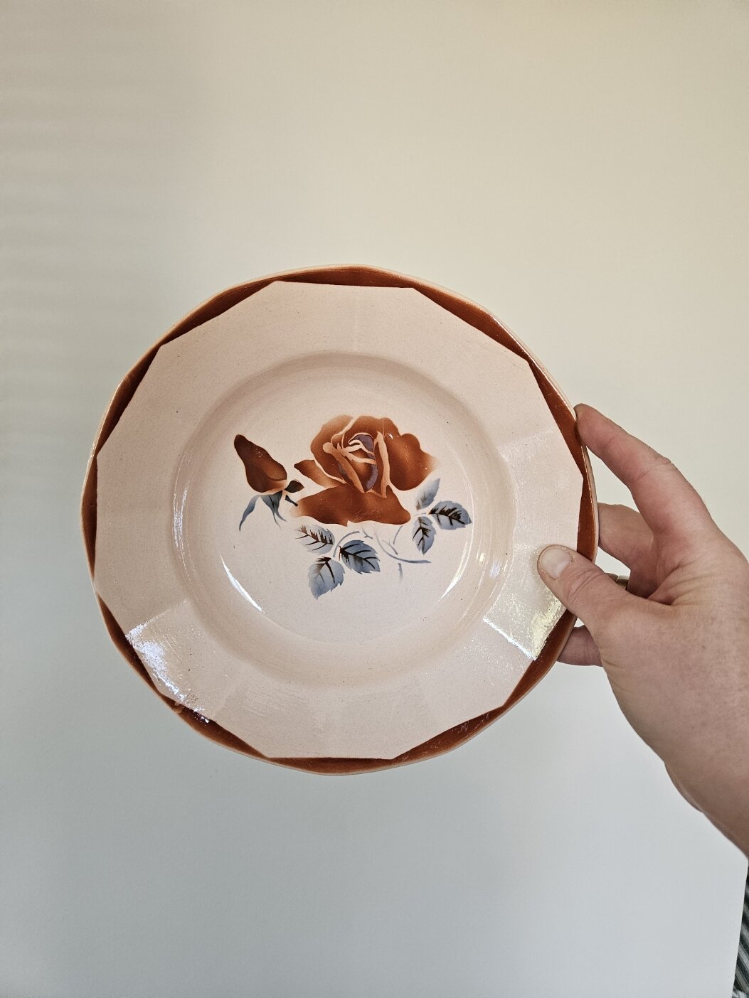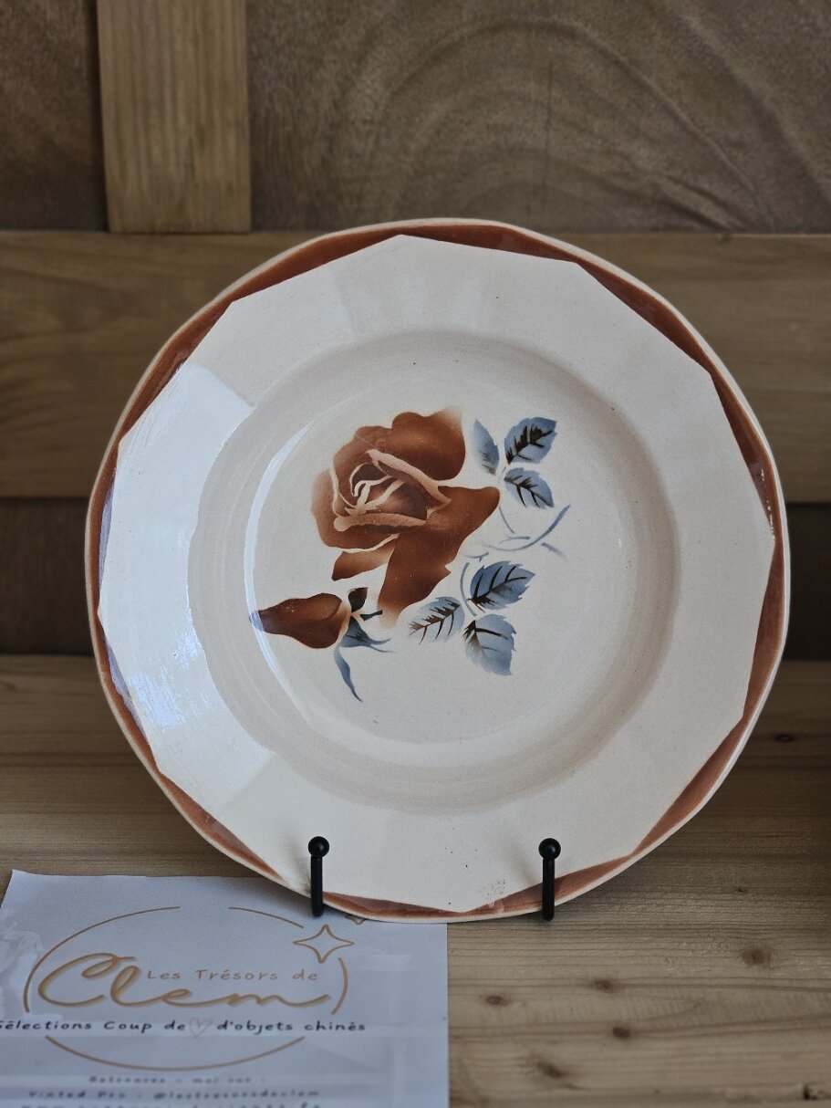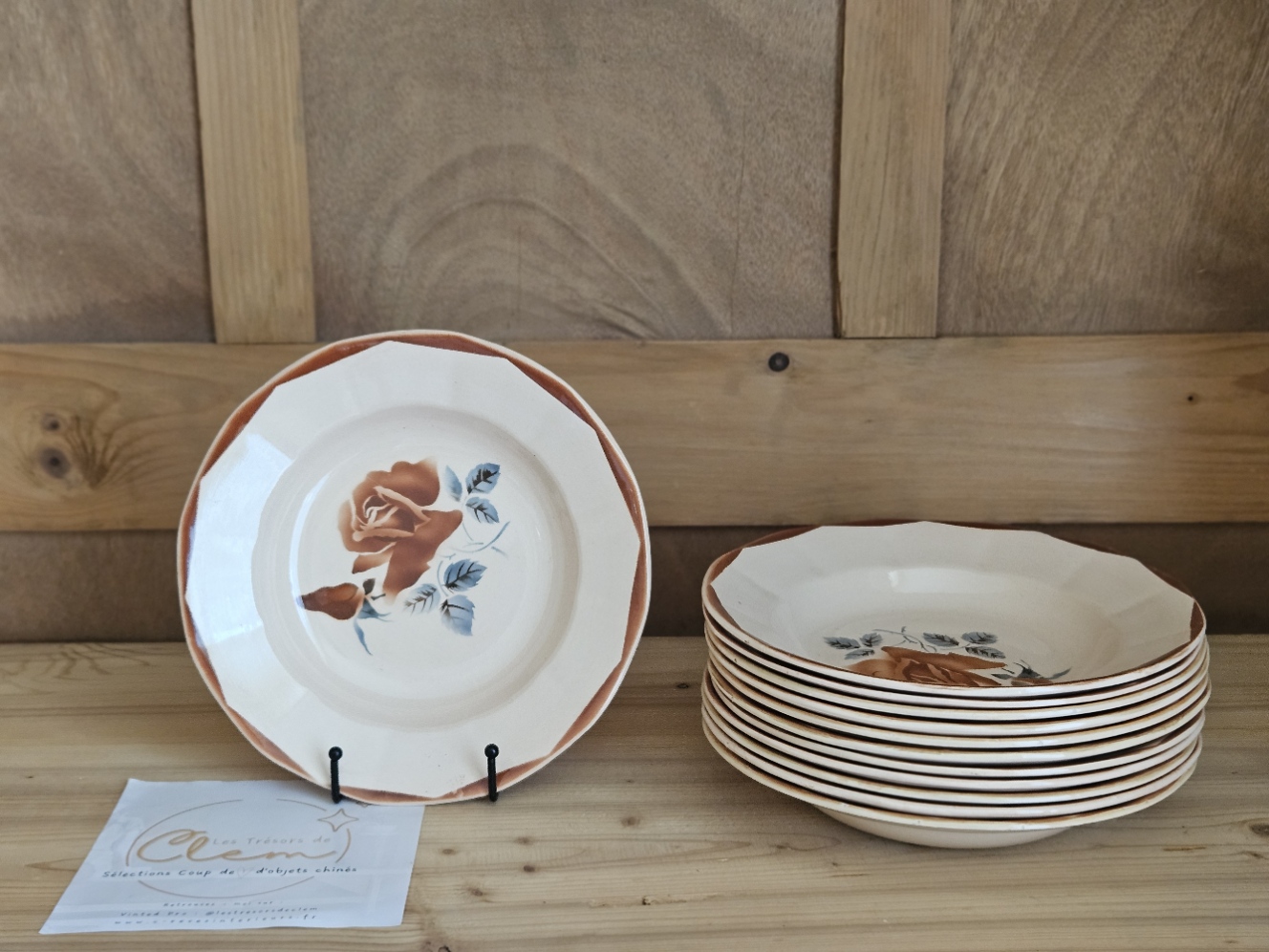 Découvrez ce joli lot de 6 assiettes creuses anciennes Digoin & Sarreguemines, au décor floral élégant dans des nuances de brique terre cuite et de bleu doux.