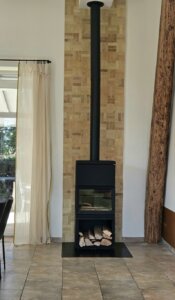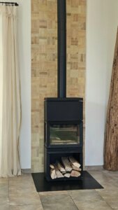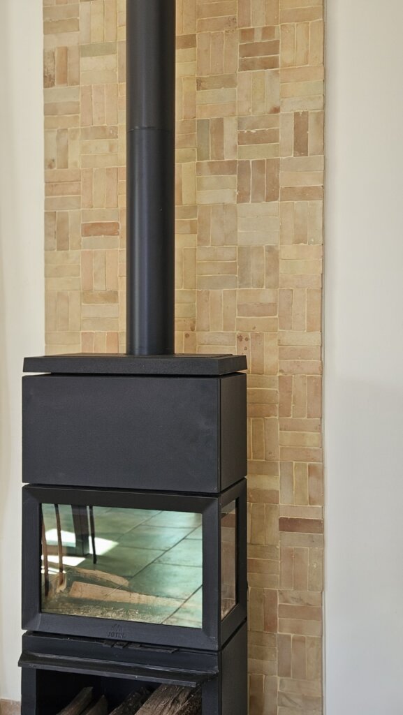 Le mur du poêle à bois est sublimé par un revêtement en Bejmat, carreau artisanal marocain en terre cuite, choisi pour sa texture et sa résistance.