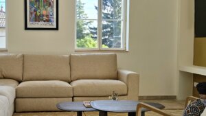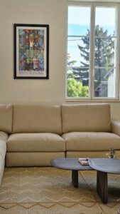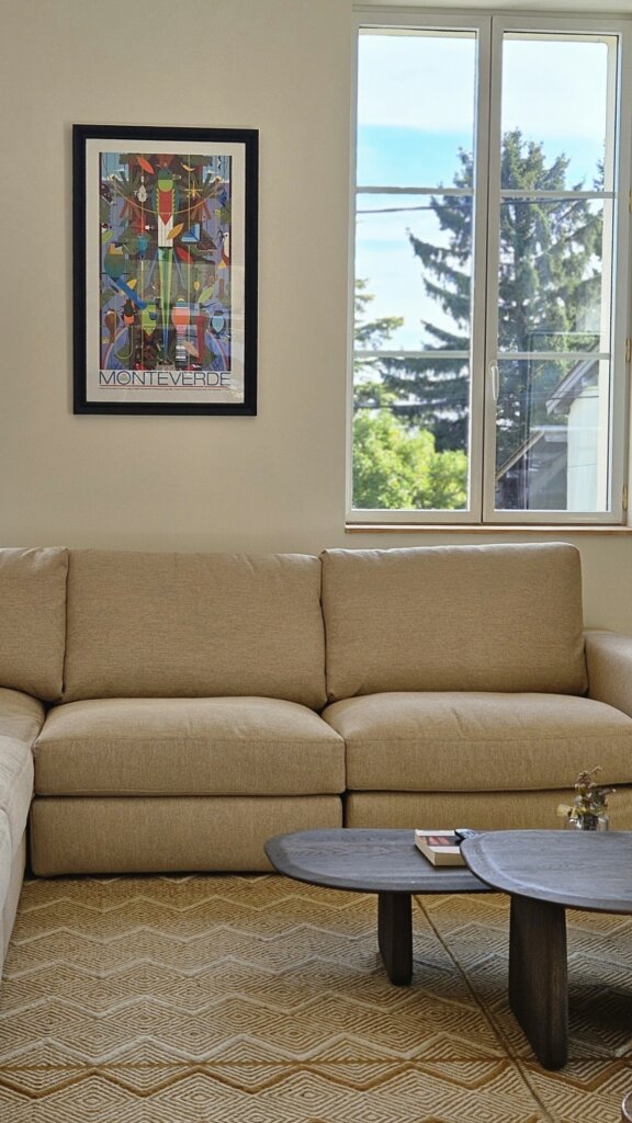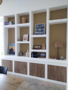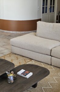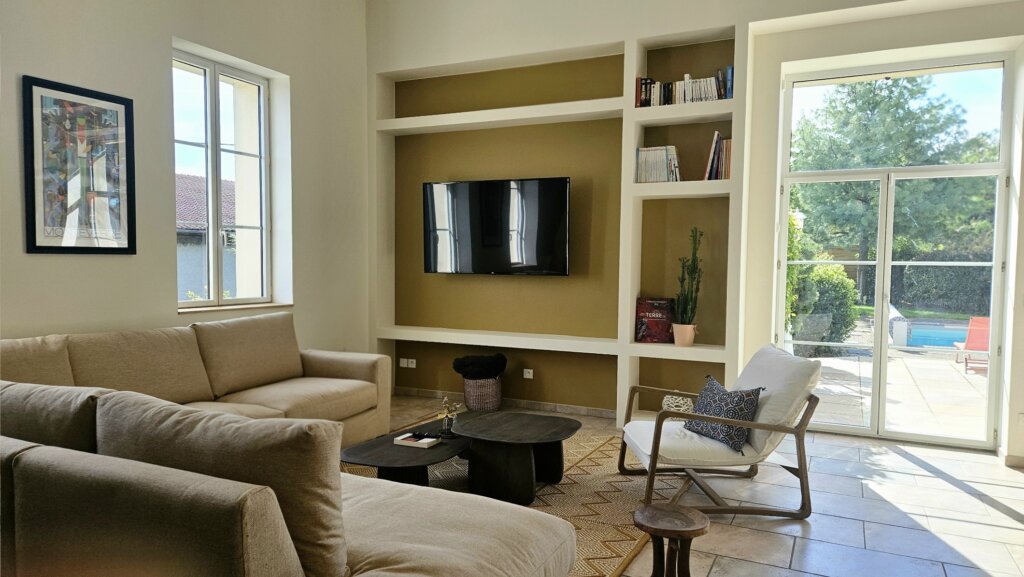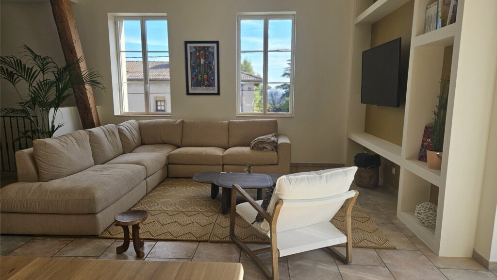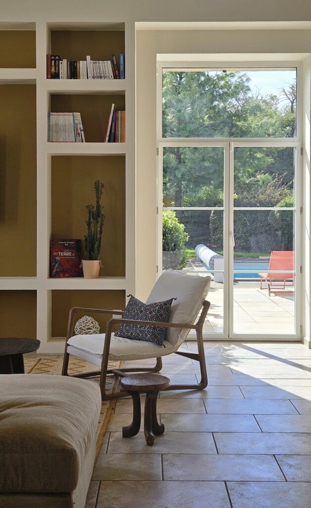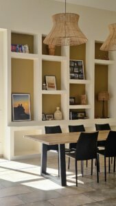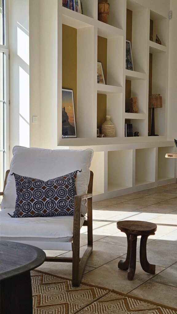 Dans le salon, le choix d’un grand canapé d’angle et de tapis en laine de grande taille permet d’habiller l’espace sans le surcharger. De plus, les niches décoratives sur mesure accueillent livres, objets chinés et souvenirs de voyages. Ainsi, elles renforcent l’esprit personnalisé et vivant de la décoration, tout en apportant confort et fonctionnalité à la pièce. De surcroît, ce dispositif crée également une continuité visuelle harmonieuse avec l’ensemble de l’espace, ce qui contribue par ailleurs à une ambiance cohérente et chaleureuse.