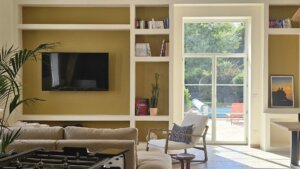 Des niches décoratives sur mesure structurent les murs et accueillent objets et livres, tandis qu’un canapé d’angle XXL habille les volumes du salon.