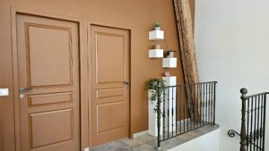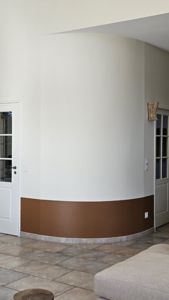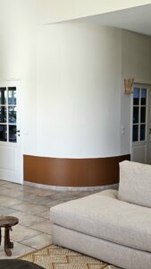 J’ai travaillé une palette douce et lumineuse, un blanc chaud légèrement teinté de jaune pour accrocher la lumière, associée à la teinte Marmelo de Farrow & Ball, un terre brûlée profond qui donne du caractère dès l’entrée.