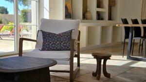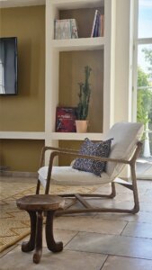 Le mur du poêle à bois, habillé de Bejmat artisanal, devient un véritable élément central, associant à la fois fonctionnalité et esthétique. De plus, les objets chinés et les matériaux naturels apportent également authenticité et caractère à l’ensemble, contribuant ainsi à une ambiance chaleureuse et harmonieuse.