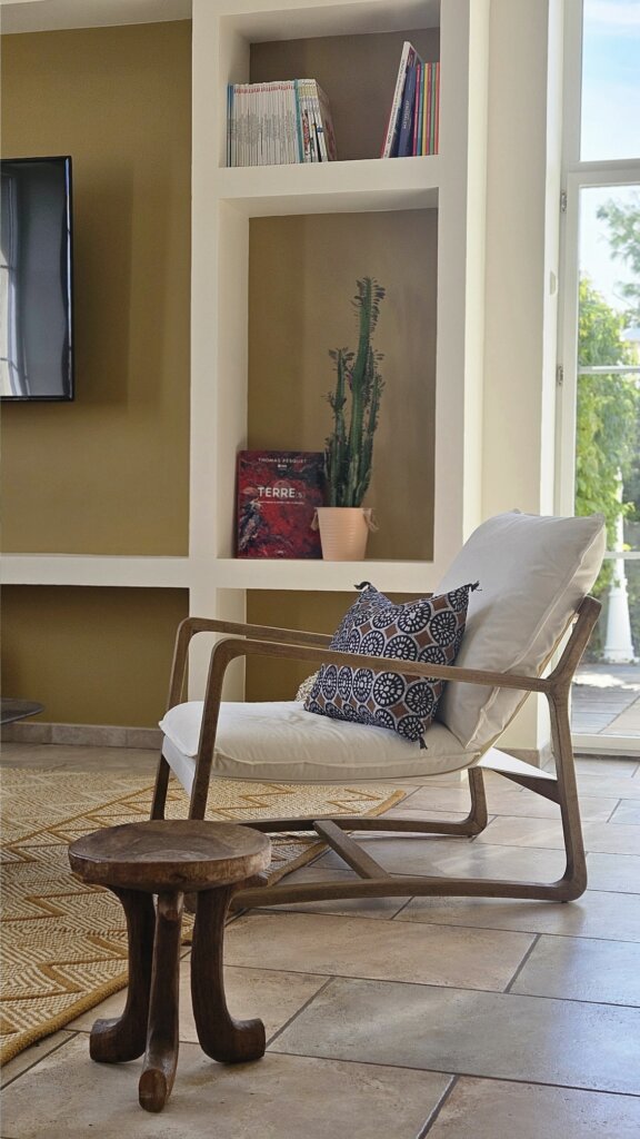 L’ensemble est ponctué d’objets chinés et authentiques, comme un tabouret Oromo d’Éthiopie ou une lampe en bois exotique issue de ma boutique Les Trésors de Clem, pour un rendu chaleureux et sincère.