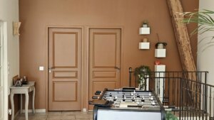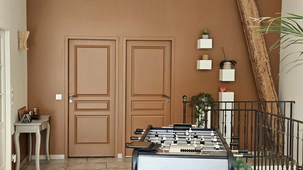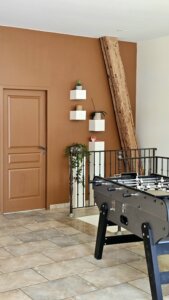 Chaque espace de cette ancienne grange a été repensé pour optimiser la lumière naturelle et les volumes généreux, tout en conservant l’authenticité du lieu. L’entrée donne le ton avec une palette de couleurs chaleureuse, ponctuée de teintes terre brûlée qui servent de fil conducteur.
