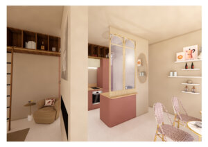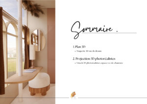 - 26 €/m² : planche d’ambiance générale, plan d’aménagement 3D détaillé et annoté, rendus 3D photoréalistes (vues multiples), entretien visio, envoi du dossier par mail en haute définition (PDF ou JPG, selon votre préférence).