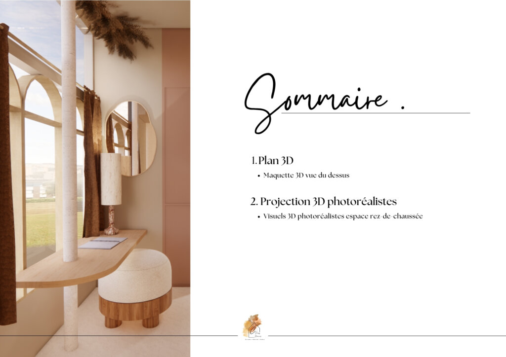- 45 €/m² : planche d’ambiance générale, plans 2D et 3D d’aménagement détaillés et annotés, recherche shopping et shopping liste personnalisée, rendus 3D photoréalistes (vues multiples), entretien visio, envoi du dossier par mail en haute définition (PDF ou JPG, selon votre préférence).